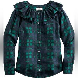 J. Crew Collection Sueded Silk Plaid Ruffle Collar Green Blue Plaid Blouse Large