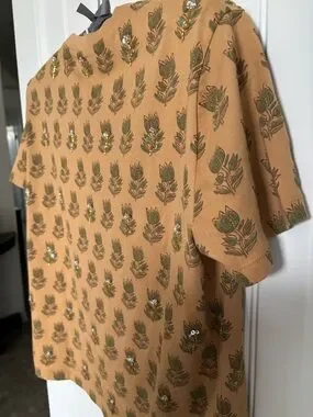 This collection tee from J Crew has a beautiful SZ color blocked print. This one has added jewels that sparkle nice. The length is 21” with the pit to pit is 19”. Material is soft cotton and comes in warm caramel. Worn once.