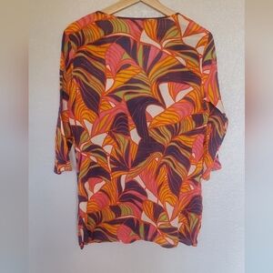 Vibrant tunic with bold leaf pattern. Features orange, purple, and pink hues. Ideal for a standout look.
