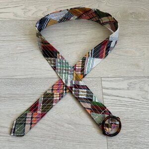 Vintage J. Crew Women's Colorful Adjustable Retro Preppy Madras Patchwork Plaid Cloth Belt with Tortoise Buckle.