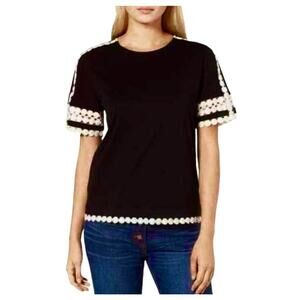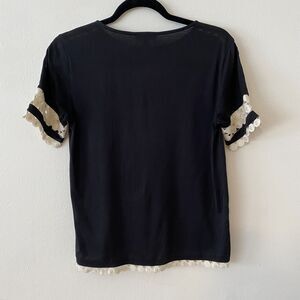 J Crew Comfy Black and Cream Embroidery Stitch Circles Sleeve Hem Design Top XXS