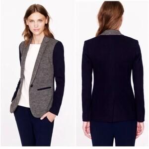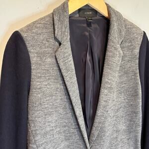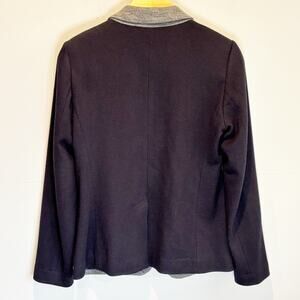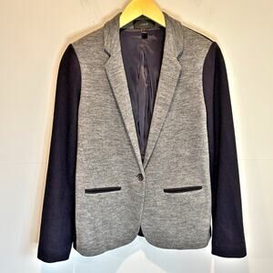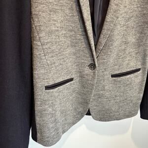 Gray and navy. One button closure. Light shoulder padding sewn in. Pockets at the front are still sewn shut. Lined.