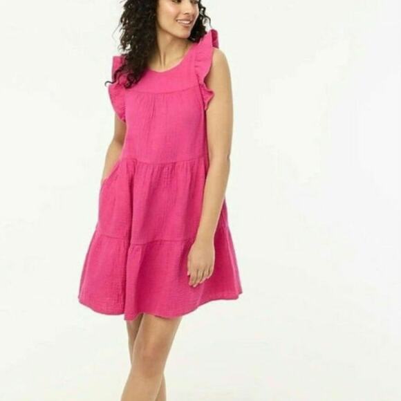 The J Crew Cotton Gauge Sleeveless Cute Mini Dress in pink is a charming and versatile addition to your wardrobe. Made from soft cotton, this sleeveless mini dress offers a relaxed and effortless fit that's perfect for casual outings or beach days. Its stretchy fabric ensures comfort while maintaining a flattering silhouette. With a 36" length, it’s ideal for warm-weather occasions, providing a feminine, playful look. The snagging on the chest doesn’t take away from its overall appeal, and it's ready for styling with sandals or sneakers for a cool, laid-back vibe. Its simple design and timeless style make it a perfect versatile piece for your collection, ready to be dressed up or down for any occasion.