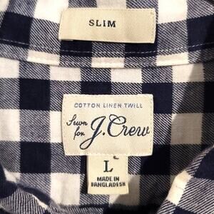 Men's J. Crew Cotton Linen Twill Slim Blue Gingham Button Down Shirt - it's a size Large and in good pre-owned condition. Material feels like a soft, thin flannel.