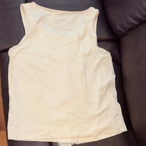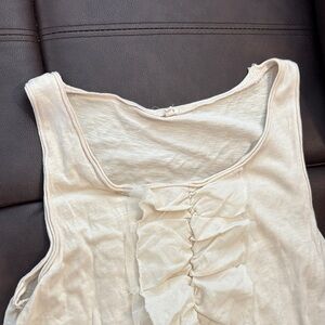 Soft cream tank top with gathered ruffle trim down the center. Lightweight knit fabric for easy layering. Simple scoop neckline and sleeveless cut.