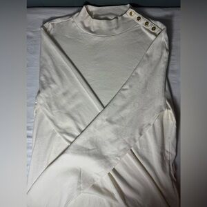 Elegant cream sweater. Features gold button accents on shoulder. Long sleeves. Perfect for layering.