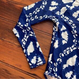 Stylish and sun-safe! This long sleeve rash guard swimsuit from J.Crew CrewCuts features a beautiful batik print in shades of blue and cream. Designed with a convenient 1/2 zip front for easy on and off, it’s perfect for active days at the beach or pool.