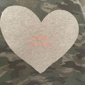 Gray camo print with gray graphic heart with pink stitching “Wear Your Heart”
