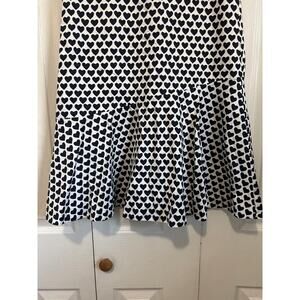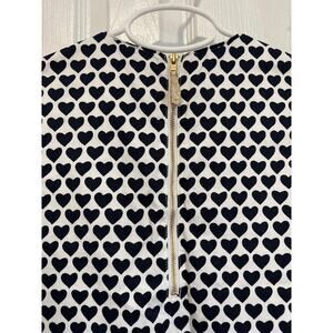 • Features: White with navy hearts, gold contrast back zipper, asymmetric/“flex” hem, partially lined