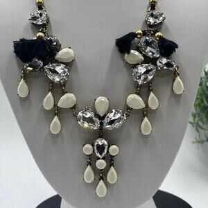 J. Crew Crystal Clear Milky White Gems Black Fringe Adjustable Tie Necklace