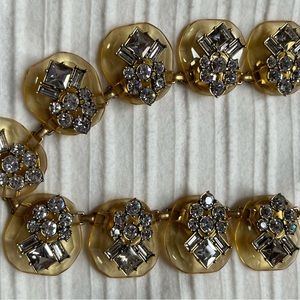 This sparkling crystal & yellow lucite necklace is in beautiful great condition. The crystals are clear, bright & have lots of fire. The chain is goldtone & the necklace measurement is 18”. The clasp is the J Crew style & it has the J Crew hang tag. The back of the necklace is in very nice shiny golden condition. A great statement necklace!