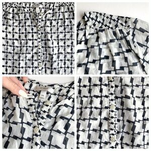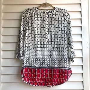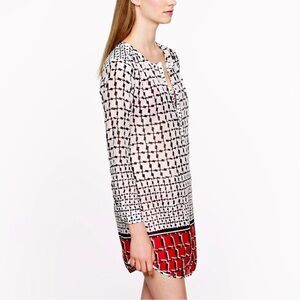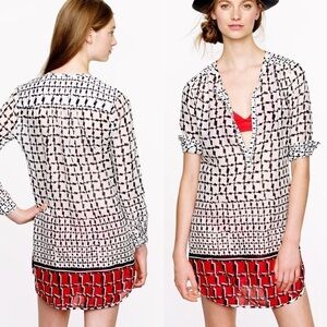 J. Crew Voile Cubist Houndstooth Tunic in white, black and red. This airy tunic pops in a print that's an exotic twist on houndstooth. Hits at midthigh. Buttons down front. Cotton. Long sleeves. Worn once and in excellent condition with no visible signs of wear. Size XXS but fits like XS. Approx. 30” long and 19” across from armpit to armpit.