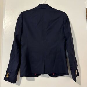 Inspired by vintage prep school uniforms. Slim silhouette with a slightly cropped length. Gold crest buttons. Notch collar with felt under collar. Single breasted. Function cuff buttons. Back vent. Lined