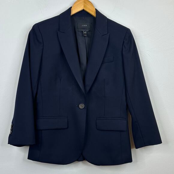 J. Crew Dark Navy Sidney Super 120's Wool Lined Blazer. Great gently used condition. Lined. 3/4 length sleeve. One button closure. Chest welt pocket. Flap welt pockets. Interior pocket.