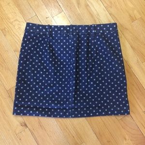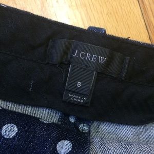 Gently worn Size 8 J. Crew Denim Skirt with Polka Dots. Measures approximately 17 inches laying flat across the waist and 15 inches in length. Has front pockets. 98% cotton, 2% spandex. No rips, stains or tears. Non-smoking home.