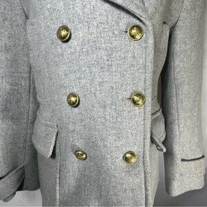 J. Crew Double Breasted Stadium Cloth by Nello Gori Majesty PeaCoat. Light Gray with Gold Buttons. Size 14. A timeless peacoat, crafted in cozy stadium-cloth fabric that's made especially for J. Crew by Italy's famed Nello Gori mill. Inspired by the fabric used in old-school stadium blankets, it adds warmth without the bulk Wide lapels and welt pockets. Four pockets and one buttoned inside pocket. Lined. Some light wear but in otherwise excellent used condition.
