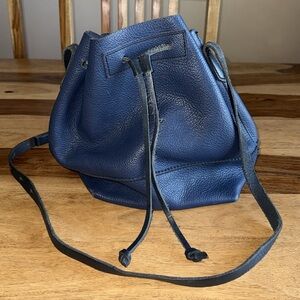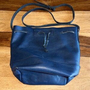 J. Crew Downing blue leather crossbody bucket bag. Drawstring strap closure. Inside pocket has loose threads at top of pocket as seen in photo. 13” x 10” x 5 3/4”. Very good pre owned condition