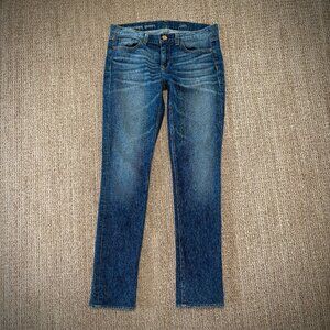 These classic cool girl jeans from J. Crew are perfectly broken in and soft, not stiff. Intentional whiskering on front. Very little stretch. Mid rise. Machine wash cold. Flat measurements: Waist = 16", Rise = 8", Inseam = 30".