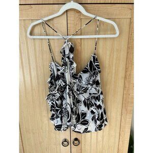 This is a J.Crew tank top in size Large, featuring a black and white floral pattern with a V-neckline and sleeveless design. The tank top has a drapey silhouette with ruffle accents, making it a stylish and feminine addition to a woman's wardrobe. It is brand new with tags attached.