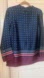 Elegant navy blue tunic with red and white geometric patterns. Long sleeves and a relaxed fit. Ideal for versatile styling.
