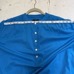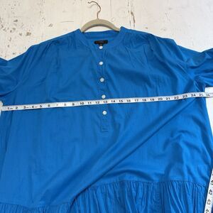 The J Crew dress is a flowy cover-up in size XS, made from lightweight organic cotton in a solid blue color. It features a tiered, oversized design that is perfect for re-imagining and personalizing. With a comfortable fit and breathable material, this garment is ideal for beach-themed occasions. Machine washable and above-the-knee in length, this cover-up is both stylish and practical for women looking to add a chic touch to their swimwear ensemble.