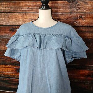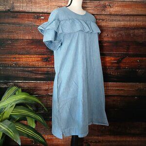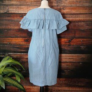 J Crew Dress Size 12 Edie Chambray Ruffle Shift Zip Back Cotton Pockets