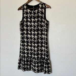 J. Crew silk dress, wolfstooth print dress, houndstooth shift dress, black and cream cocktail dress, sleeveless silk sheath, women’s size 4 dress, flounce hem party dress, classic timeless workwear dress, J.Crew, J. Crew, J Crew, and JCrew
