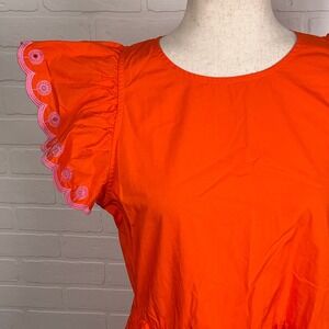 Keywords: J. Crew, tiered dress, ruffle sleeve, eyelet trim, orange dress, cotton dress, poplin dress, womens dress, summer dress, casual dress, small dress, J.Crew dress, J. Crew orange dress, J. Crew tiered dress, J. Crew ruffle sleeve