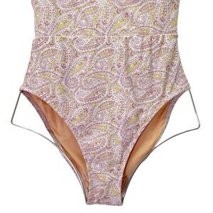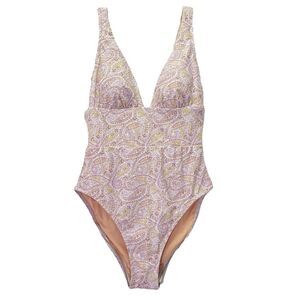 paisley one piece, beach swimwear, tie back swimsuit, plunge one piece, pink swimsuit, recycled fabric swim, J.Crew swim, summer swimwear, boho beachwear, poolside look, eco-friendly swimsuit, size 6 one piece, boho swimsuit, floral swimsuit