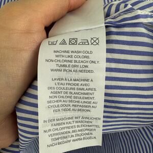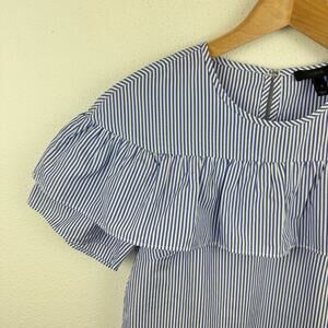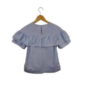 100% cotton, white & blue stripes, short sleeves, keyhole back with button closure, ruffle detail, size 0.
