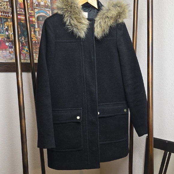 J. Crew Elegant Black Pea Coat with Faux Fur Trim 8 Medium