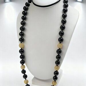 This is a J. Crew black beaded necklace with crystal or rhinestone accents. The necklace features large black beads interspersed with crystal-studded balls and is a longer, single-strand style in excellent condition.