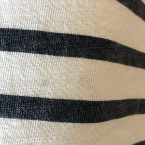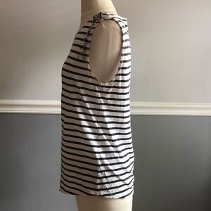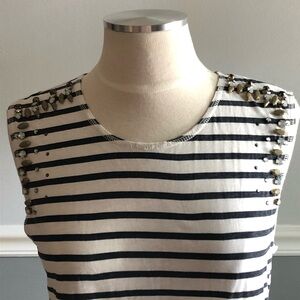 J. Crew tank top in navy and white stripes with embellished bead detail on shoulders. Beads and gems are different sizes and colors, as pictured. 100% cotton. Size Small. Small, faint mark on lower part of front, as pictured, not very noticeable.