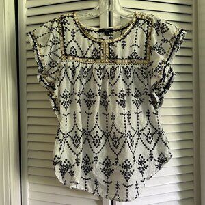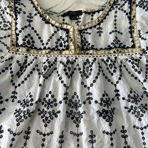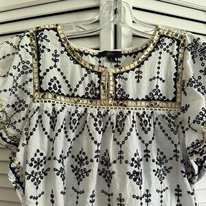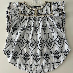 J Crew Embroidered Eyelet Flutter Top Blouse Shirt White Black Gold Small