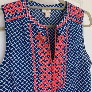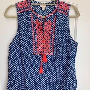 J Crew Sleeveless Floral Embroidered Tassel Printed Top size 8. Royal blue with white diamond diagonal criss cross pattern. Has bright coral pink flowers accent detailing along the front neckline and shoulder hems. Slight small V neck.