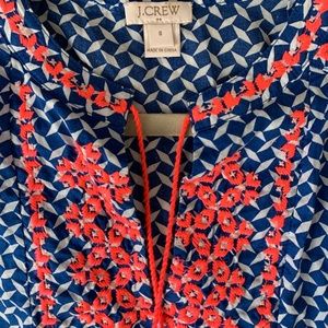 J Crew Embroidered Flowers Tassel Printed Top Blue w/ white & coral pink size 8
