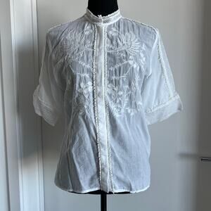 J Crew Embroidered Lace Trim Button Up Shirt In Cotton Voile Size 2 White FLAWS