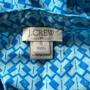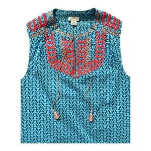 J Crew sleeveless pullover blouse. Blue with hot pink embroidery and tassels.