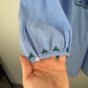 Lightweight cotton, embroidered, adjustable tie neckline with tassels, 3/4 sleeves with button cuffs, size small.