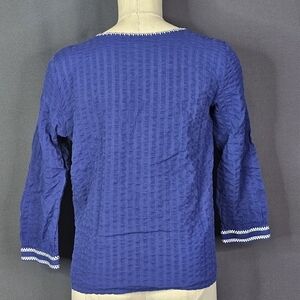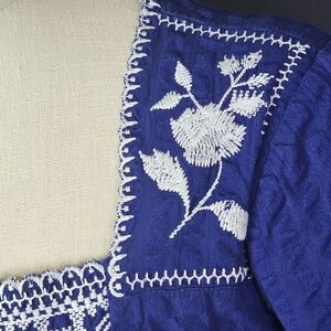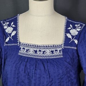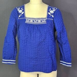 Pre-loved Conditions Chic blue blouse with delicate white embroidery. Features a square neckline and three-quarter sleeves.