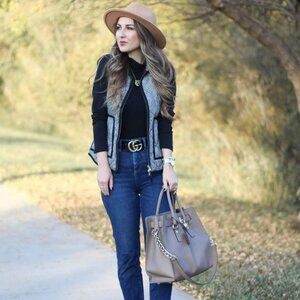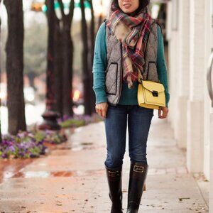 This iconic J. Crew light-as-air puffer vest is completely compact and easy to layer yet warm enough to keep winter's chill at bay. J. Crew glamorized the sporty shape with a slimmer silhouette and gold hardware for a dose of downtown cool. Filled with genuine down and waterfowl feathers. Black and cream color scheme. The all-over printed herringbone pattern gives it a classic touch. Can be styled in so many ways. Loved by many fashion bloggers.