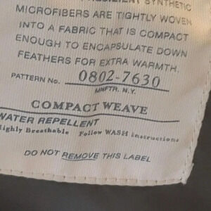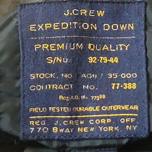 This J.CREW Expedition Down Compact Weave Hooded Puffer Jacket is designed for men in size Small. Made of polyester with down insulation, this mid-length jacket features a solid black color with quilted accents and a zipper closure. The hooded design and regular fit make it suitable for travel and casual wear during the Fall and Spring seasons, embodying a Gorpcore style. The jacket is crafted in China and bears the J.CREW brand.
