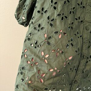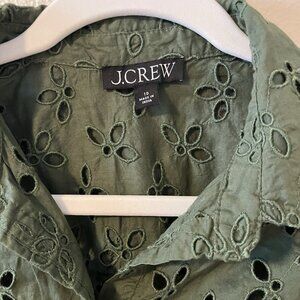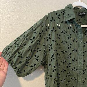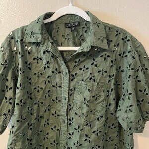 J Crew Eyelet Top Blouse Green 10 Boho Floral Preppy Puff Sleeve Button Up Boho