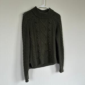 J. Crew Ezra Cable Knit Pom-Pom Crewneck Sweater Boho Grandpa Army Green S