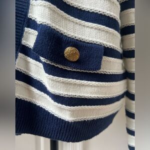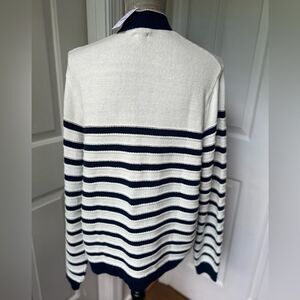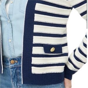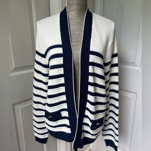 NWT j crew factory women’s size XL medium ivory/navy cotton blend striped knit open front cardigan sweater w/ gold button accents (style number CH442)! 🦀🪩