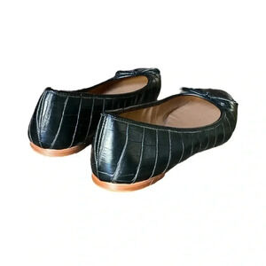 Elegant black flats with croc-embossed texture. Features a stylish bow detail. Perfect for versatile wear.