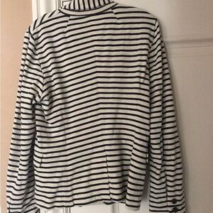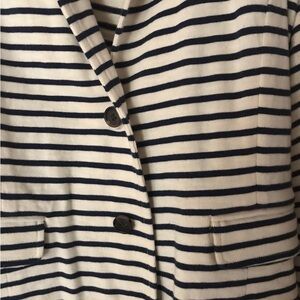 This striking blazer from J. Crew Factory showcases a bold black and white stripe pattern, perfect for making a statement. Its tailored fit and notched lapels offer a sophisticated touch, ideal for both casual and semi-formal settings. Crafted from medium-weight fabric, it ensures comfort and style throughout the day.