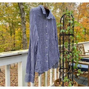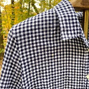 Classic blue gingham pattern. Button-down front. Long sleeves. Perfect for casual wear.