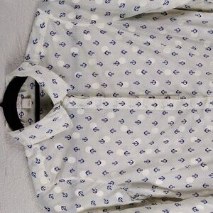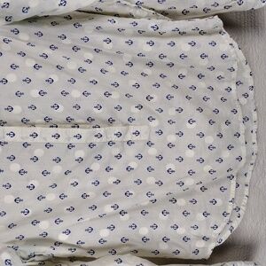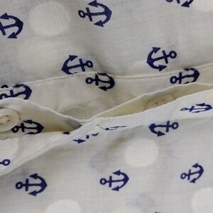 J. Crew Factory Women's Cream Off White Blue Anchor Print Nautical Theme Semi-Sheer Pointed Collar 3/4 Six Hidden Button Up Front Closure Long Sleeve High Low Hem Pullover Top. 100% Cotton. Functional Three Button Cuffs. Light Pit Mark Per Photo. Measurements approx. Flat Lay. Pit to Pit: 18, Sleeves: 23 1/4, Length: 20.5/24". Size XXS Color May Vary Due To Lighting.