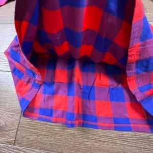Red and blue buffalo plaid print, long sleeve with button close cuff